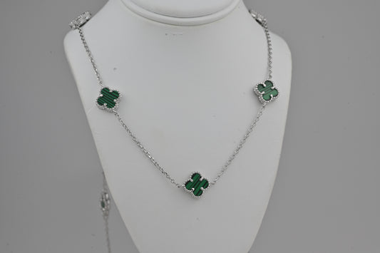 Silver Necklace Clovers malachite
