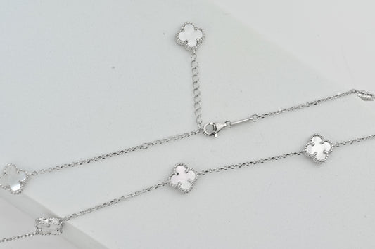 Long Silver Necklace Mother of Pearl Clovers