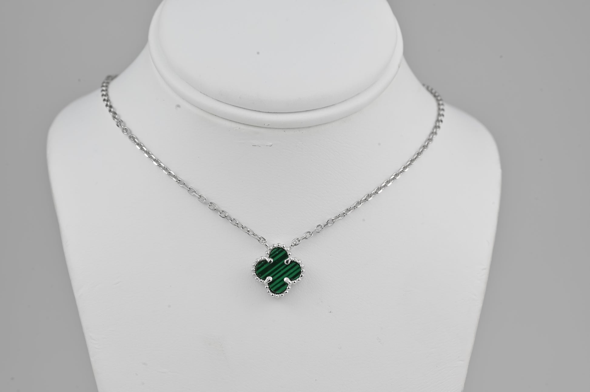 Silver Necklace Clover Malachite